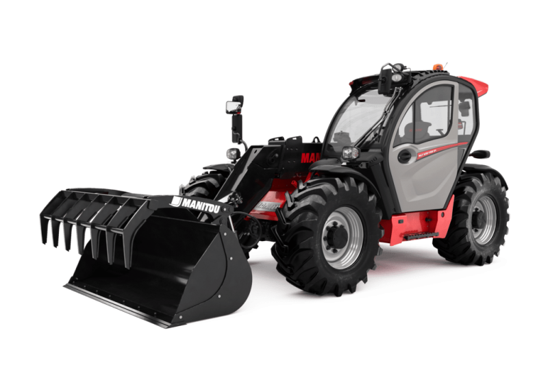 Ce chariot télescopique MANITOU 6M peut être équipé de fourches, rallonges de fourches et godet grapin.