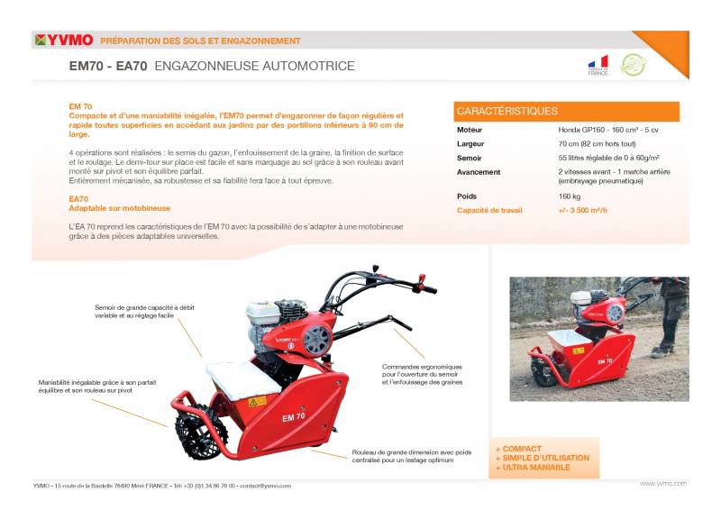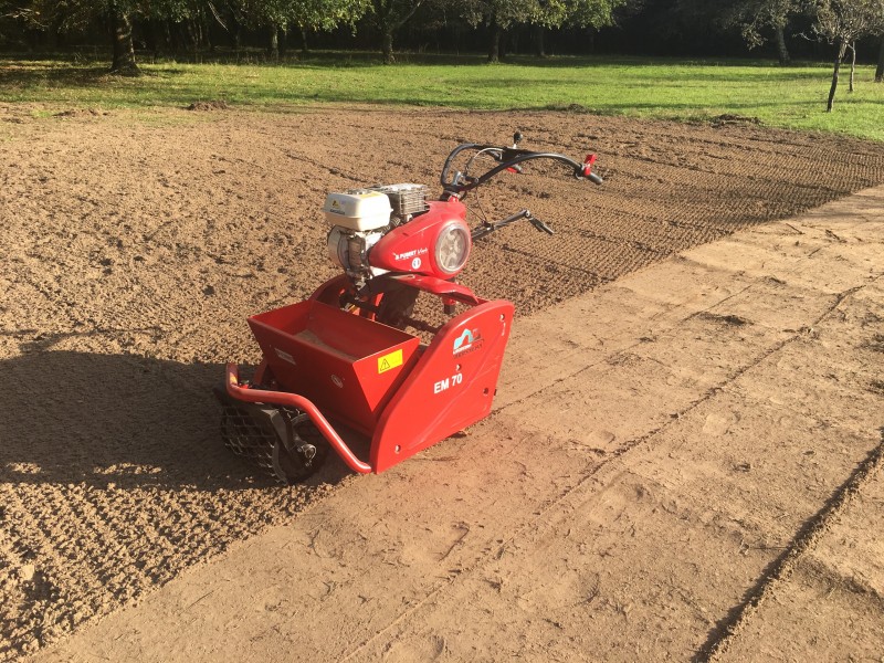Le sol doit être préalablement préparé (idéal avec le préparateur de sol) l’engazonneuse laisse s’écouler la graine uniformément à travers un semoir réglable, le rouleau central muni de pics couvre la graine de terre et le rouleau arrière lissé « plombeur » tasse le terrain achevant le travail (poids de la machine 140 kgs).