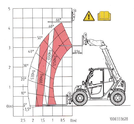 Lorsque le bras est télescopé à 2 m devant les roues du chargeur, la charge maxi est de 530 kg.