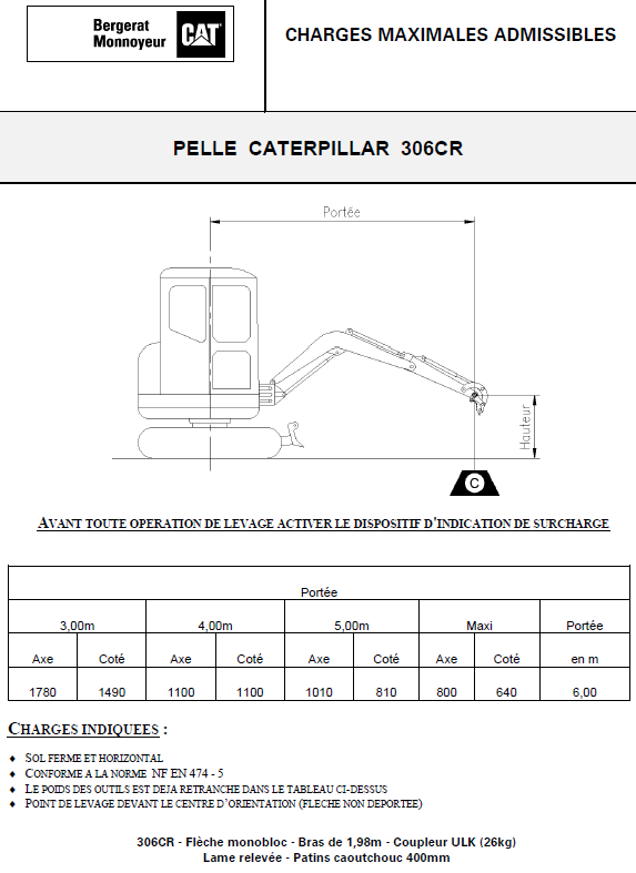 Les caractéristiques de son bras long (1.98m) permettent une profondeur maxi d'excavation de 4m, et une hauteur maxi d'excavation de 6m
