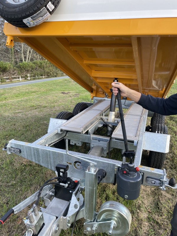Les ridelles sont rabattables et amovibles et le basculement en arrière se fait par vérin hydraulique actionné par une pompe à main.