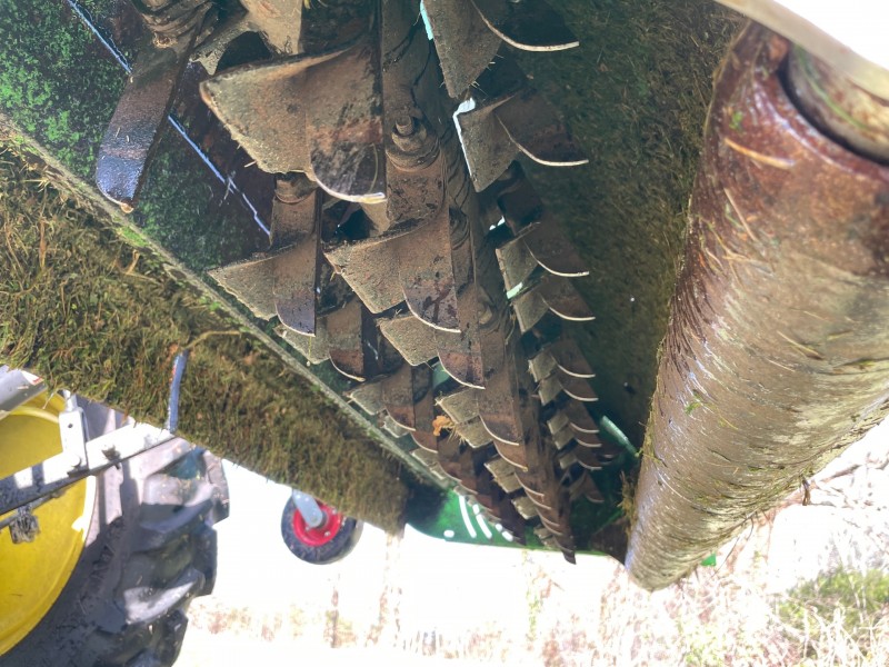 Ce tondobroyeur + bac possède des couteaux permettant, la coupe, le ramassage et le défeutrage de la surface.